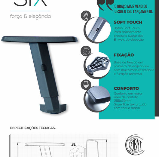 O Braço Six é o complemento IDEAL para a sua linha de cadeiras de escritório. Superando todas as expectativas, este componente é incrivelmente resistente, ergonômico e ajustável. Projetado para proporcionar um nível de conforto e produtividade incomparáveis, o Braço Six se destaca pela sua durabilidade e versatilidade. Com ele, você garante um ambiente de trabalho mais confortável e eficiente, atendendo às necessidades de diversos perfis de usuários. Escolha o Braço Six e transforme a experiência de uso das suas cadeiras de escritório.